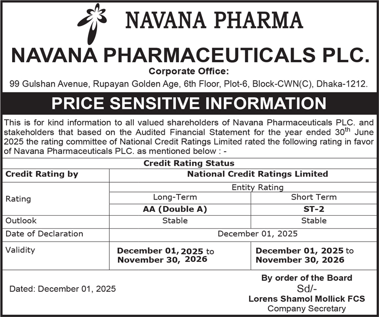 Price Sensitive Information of Navana Pharmaceuticals PLC.