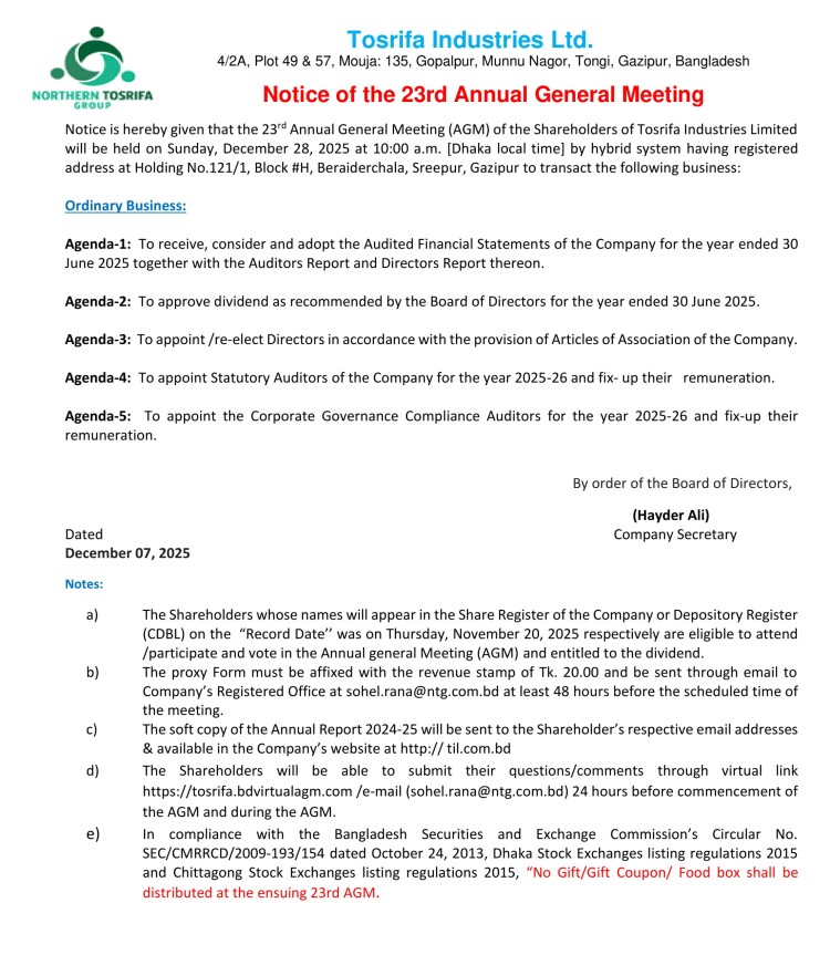 Notice of the 23rd AGM of Tosrifa Industries Limited