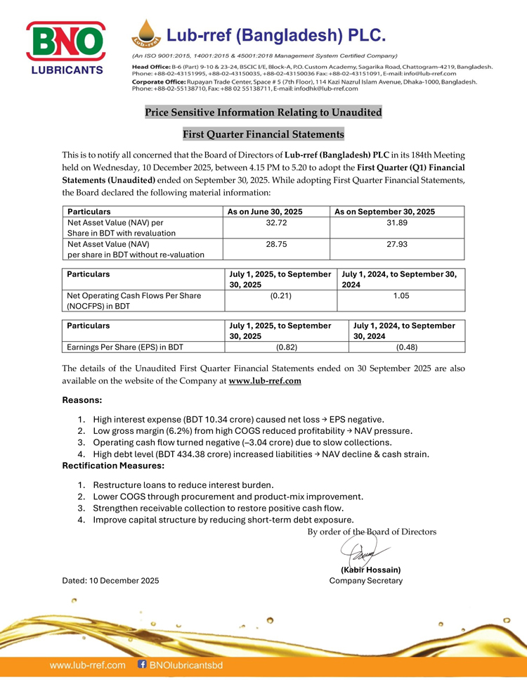 Price Sensitive Information (Q1) of Lub-rref (Bangladesh) PLC.