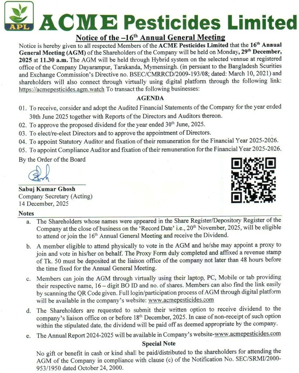 Notice of the 16th AGM of ACME Pesticides Limited