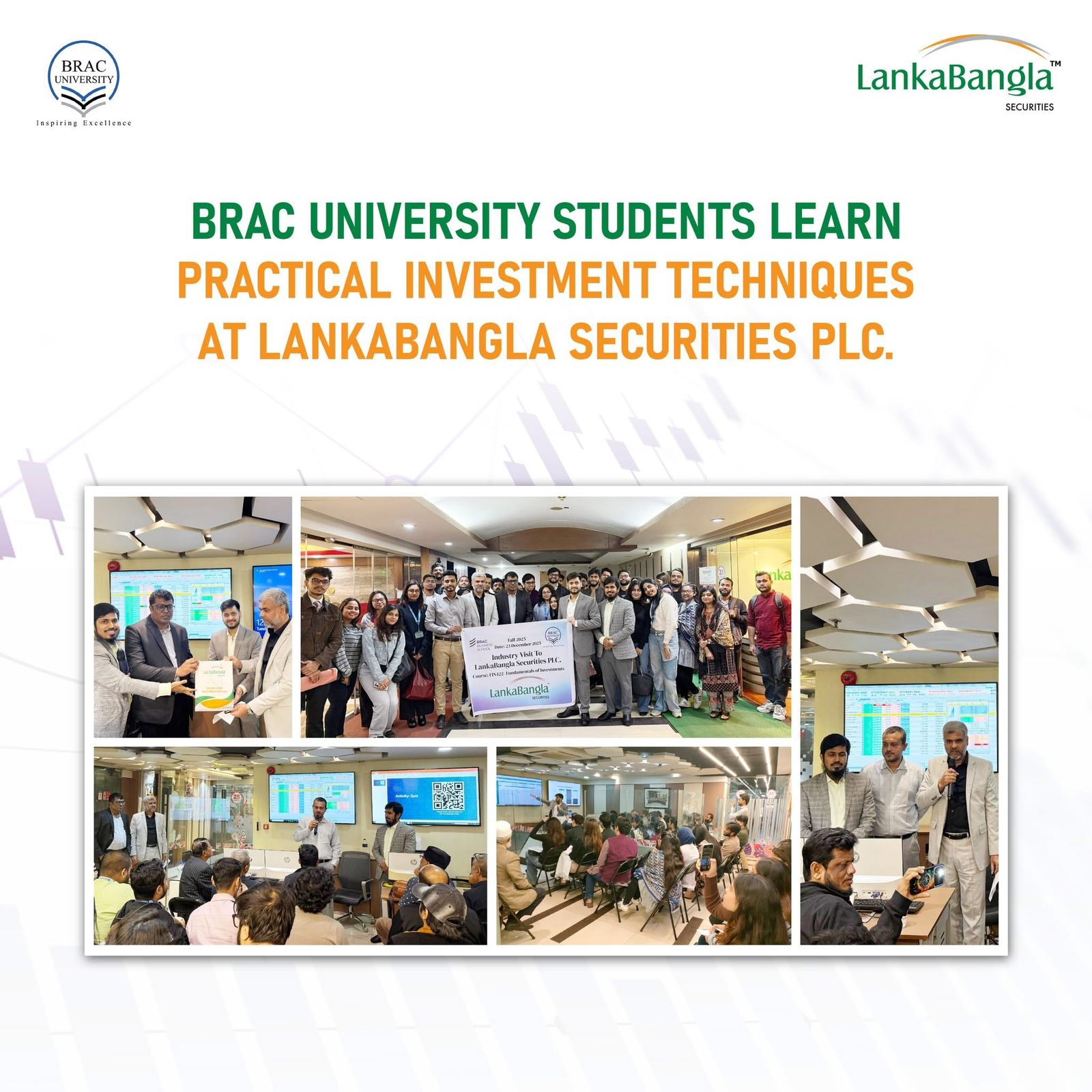 লংকাবাংলা সিকিউরিটিজ পিএলসি আজ তাদের প্রধান শাখায় ব্র্যাক বিজনেস স্কুলের শিক্ষার্থীদের জন্য একটি ইন্ডাস্ট্রি ভিজিট প্রোগ্রামের আয়োজন করে। “Fundamentals of Investment” কোর্সের আওতায় আয়োজিত এ প্রোগ্রামের মূল উদ্দেশ্য ছিল শিক্ষার্থীদের পুঁজিবাজার সম্পর্কে বাস্তব অভিজ্ঞতা প্রদান ও এই খাতে লংকাবাংলা সিকিউরিটিজ পিএলসি’র অবদান তুলে ধরা।