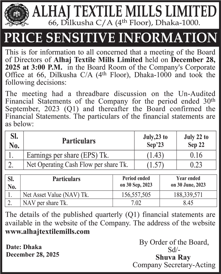 Price Sensitive Information of Alhaj Textile Milles Ltd