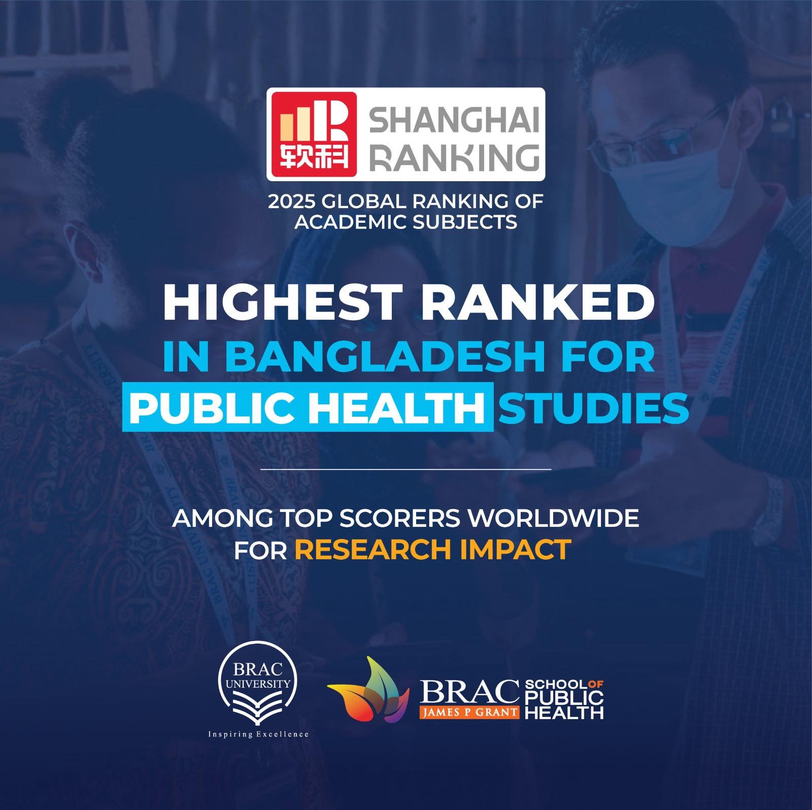 ব্র্যাক ইউনিভার্সিটি সাংহাই র্যাংকিংয়ের “২০২৫ গ্লোবাল র্যাংকিং অব অ্যাকাডেমিক সাবজেক্টস” এর পাবলিক হেলথ শিক্ষায় বাংলাদেশের সেরা বিশ্ববিদ্যালয়ের স্বীকৃতি লাভ করেছে। সম্প্রতি বিশ্বের বিভিন্ন বিশ্ববিদ্যালয়ের মোট ৫৭টি বিষয়কে এই র্যাংকিংয়ে মূল্যায়ন করা হয়েছে। এসব বিষয়ের মধ্যে রয়েছে ন্যাচারাল সায়েন্স, লাইফ সায়েন্স, চিকিৎসা বিজ্ঞান, সামাজিক বিজ্ঞান এবং প্রকৌশল শিক্ষা।