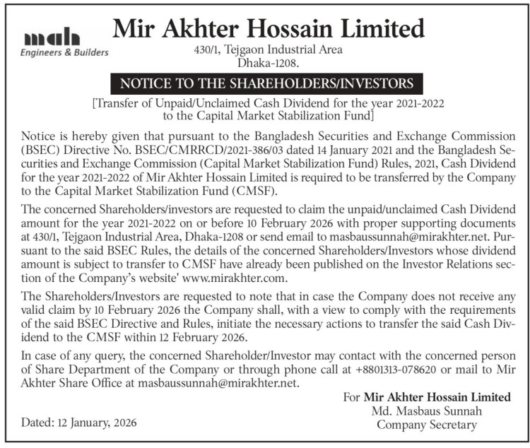Notice to the Shareholders of MIR Akhter Hossain Limited