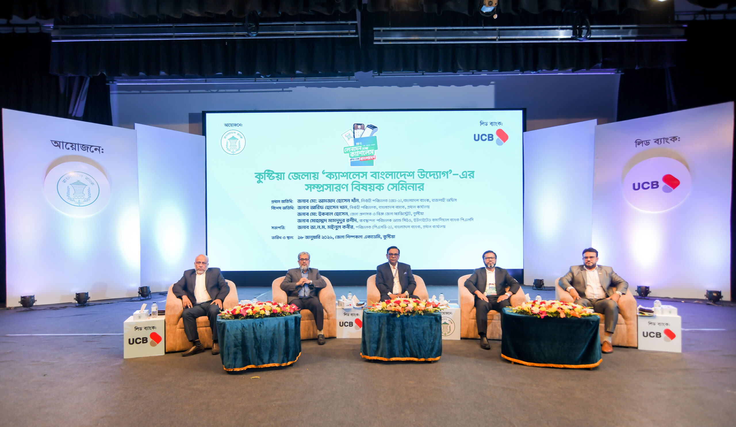 বাংলাদেশ ব্যাংক প্রধান কার্যালয়ের পেমেন্ট সিস্টেমস ডিপার্টমেন্ট-১-এর পরিচালক আ. ন. ম. মঈনুল কবীরের সভাপতিত্বে অনুষ্ঠিত বিশেষ সেমিনারে অতিথি হিসেবে উপস্থিত ছিলেন বাংলাদেশ ব্যাংক প্রধান কার্যালয়ের নির্বাহী পরিচালক ও মুখপাত্র আরিফ হোসেন খান, কুষ্টিয়া জেলা প্রশাসনের অতিরিক্ত জেলা প্রশাসক, শিক্ষা ও আইসিটি এবং উন্নয়ন ও মানব সম্পদ ব্যবস্থাপনা মো. মিজানুর রহমান এবং ইউসিবির ব্যবস্থাপনা পরিচালক ও সিইও মোহাম্মদ মামদুদুর রশীদ।