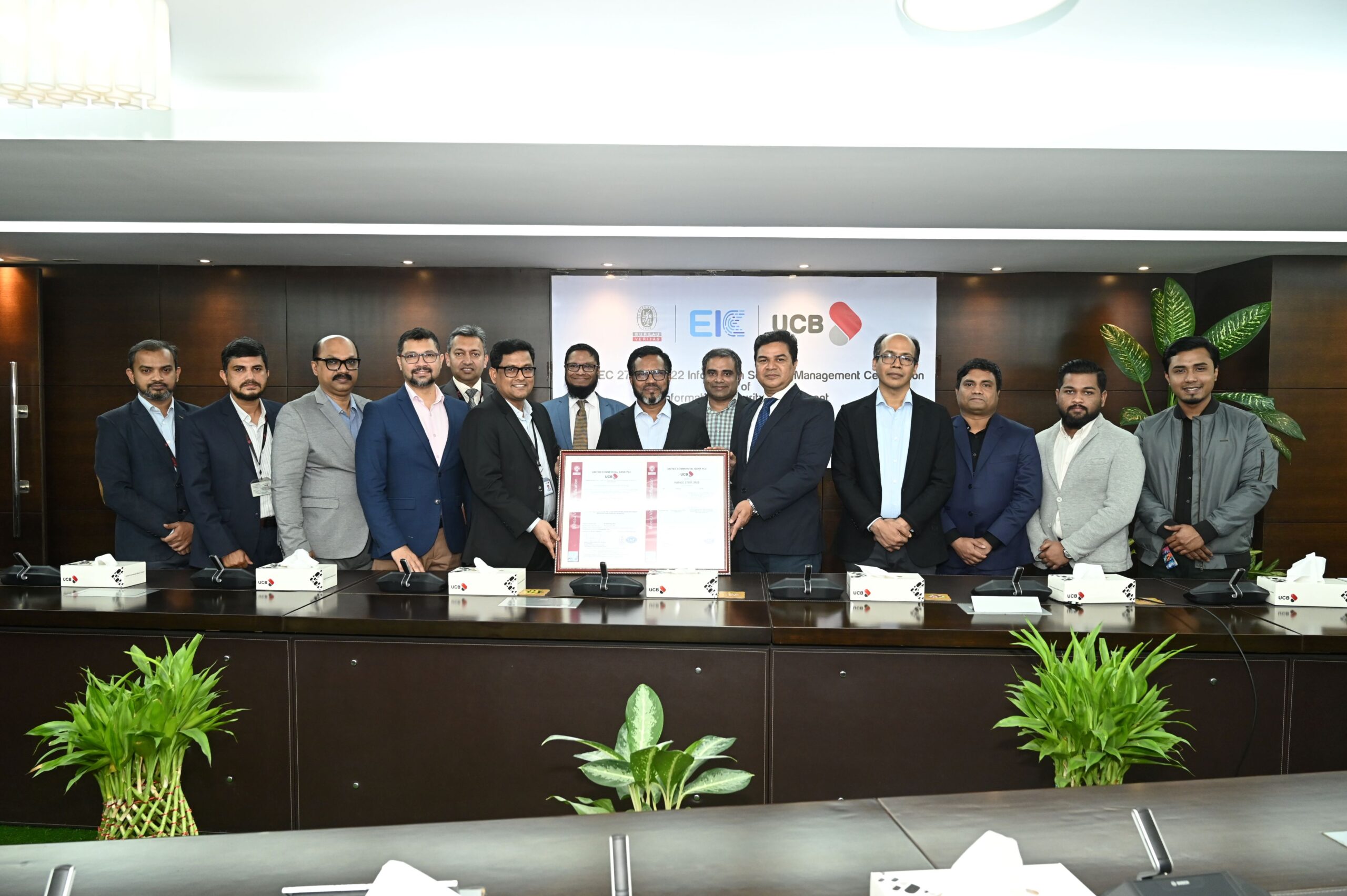 এ উপলক্ষে সম্প্রতি ইউসিবির প্রধান কার্যালয়ে এক সনদ হস্তান্তর অনুষ্ঠান অনুষ্ঠিত হয়। অনুষ্ঠানে ফ্রান্সভিত্তিক আন্তর্জাতিক সার্টিফিকেশন কর্তৃপক্ষ বুরো ভেরিটাস বাংলাদেশের কান্ট্রি হেড মুকুট কে. বড়ুয়া এবং ইআইসি’র সিইও মশিউল ইসলাম আনুষ্ঠানিকভাবে সনদটি ইউসিবির ব্যবস্থাপনা পরিচালক ও প্রধান নির্বাহী কর্মকর্তা মোহাম্মদ মামদুদুর রশিদের হাতে তুলে দেন। এ সময় ব্যাংকের অতিরিক্ত ব্যবস্থাপনা পরিচালকবৃন্দ, বিভিন্ন বিভাগের প্রধানসহ ঊর্ধ্বতন কর্মকর্তারা উপস্থিত ছিলেন।