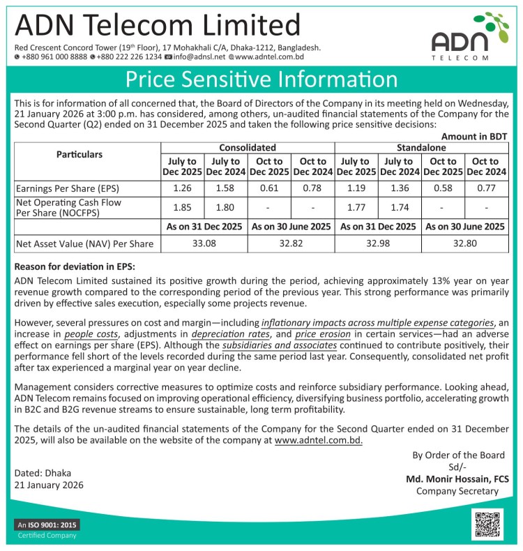 Price Sensitive Information of ADN Telecom Limited