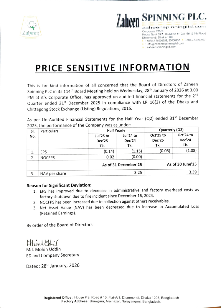 Price Sensitive Information of Zaheen Spinning PLC.