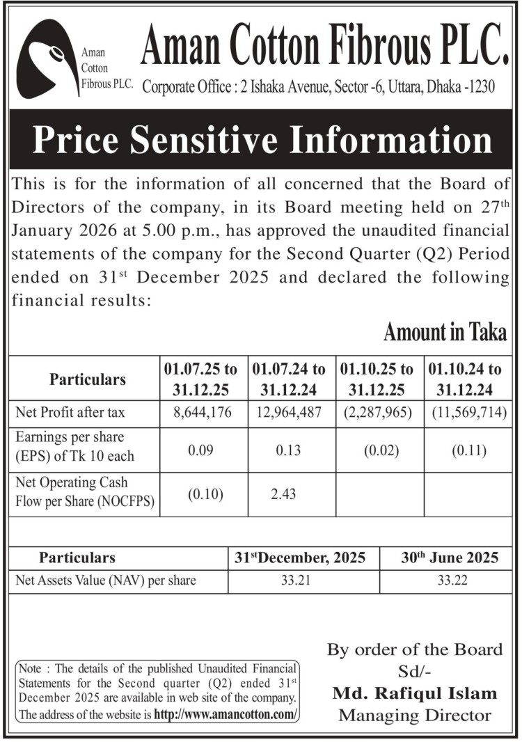 Price Sensitive Information of Aman Cotton Fibrous PLC.