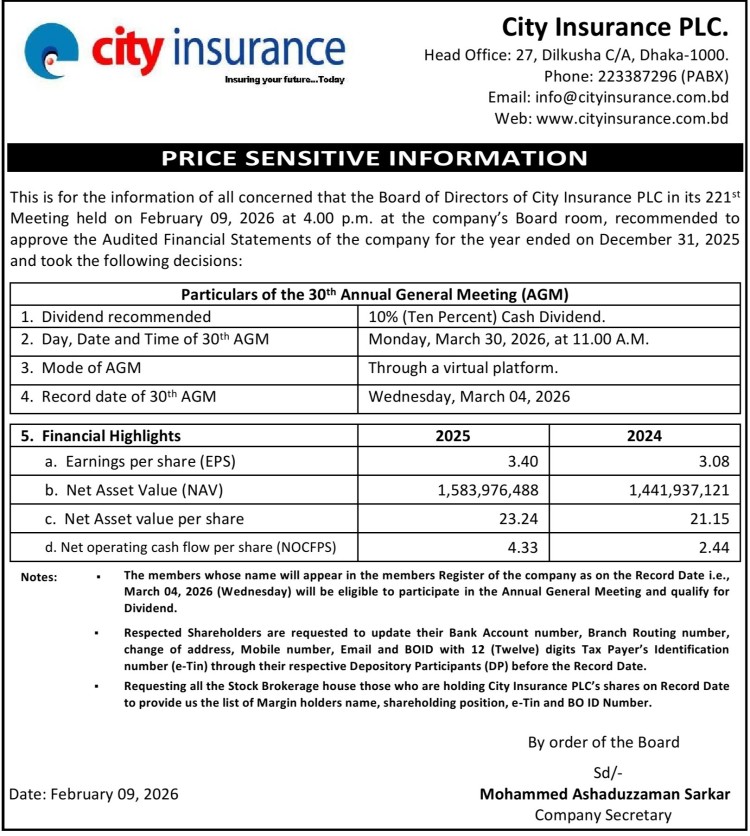 Price Sensitive Information of City Insurance PLC.