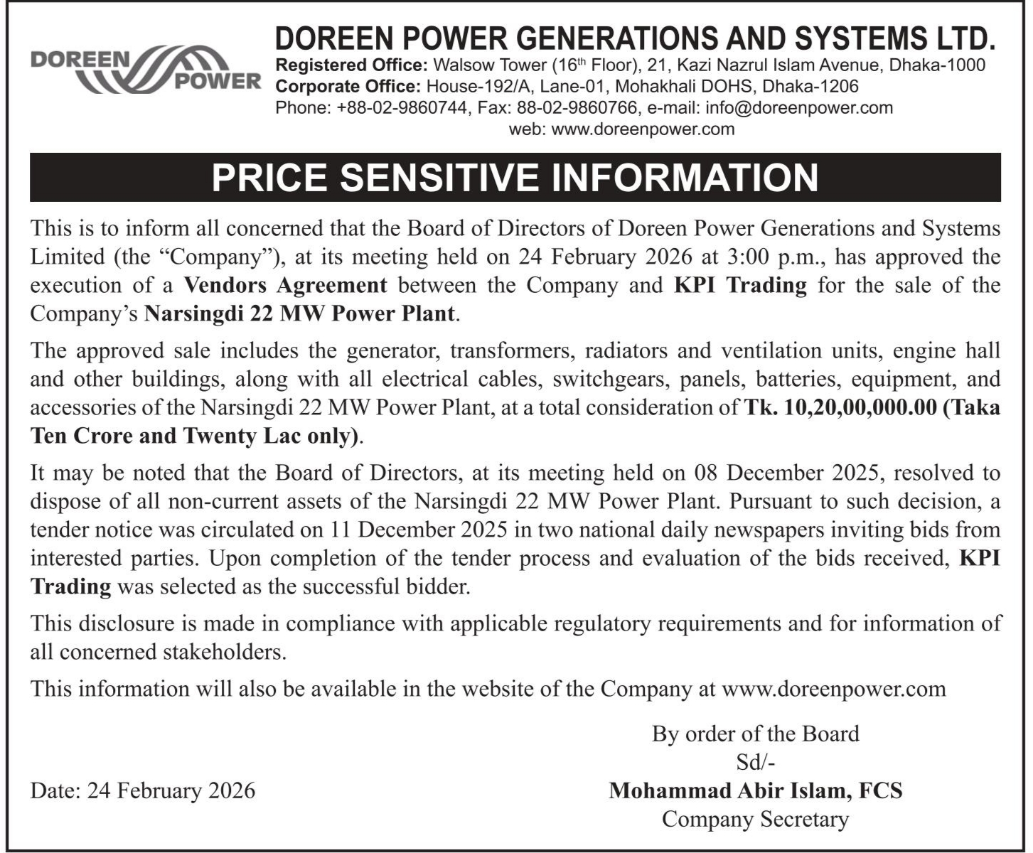 Price Sensitive Information of Doreen Power Generations and Systems Limited