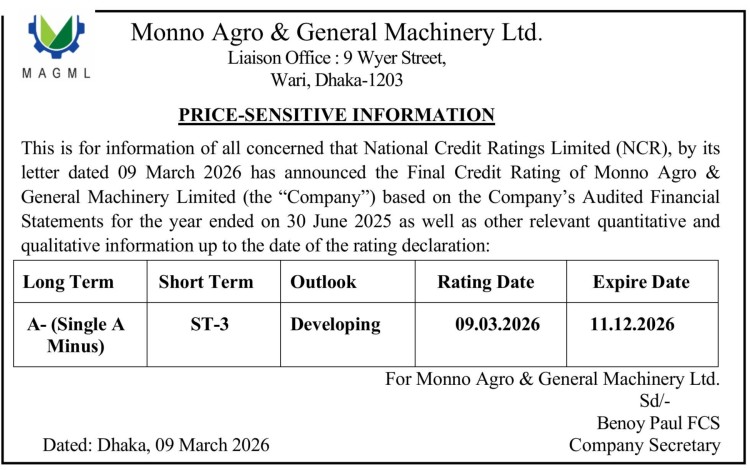 Price Sensitive Information or Monno Agro & General Machinery Limited
