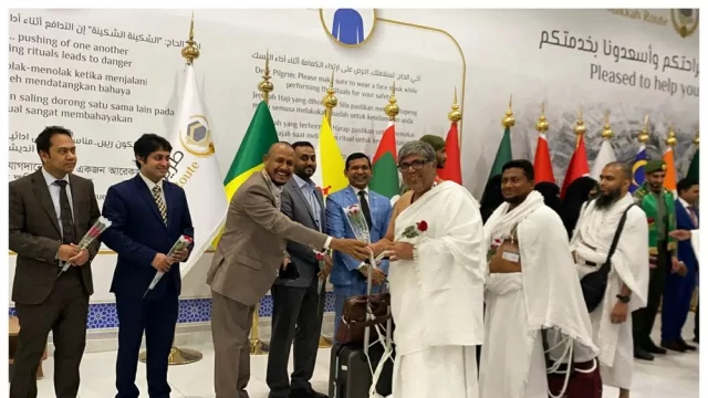 হজযাত্রীদের ফুল দিয়ে শুভেচ্ছা জানানো হয় এবং তাদের হাতে রিফ্রেশমেন্ট কিট তুলে দেওয়া হয়।
