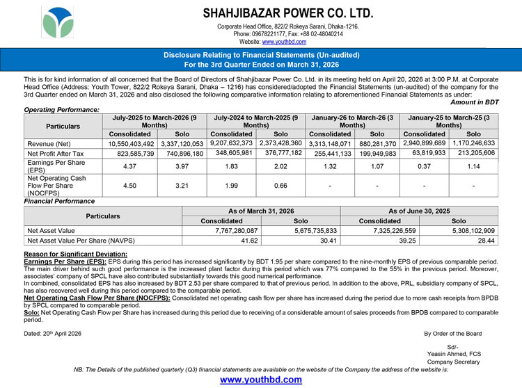 Q3 (Un-audited) Financial Statements of Shahjibazar Power Co. Ltd