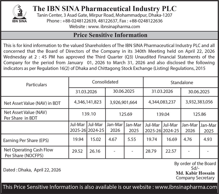 Price Sensitive Information of The IBN SINA Pharmaceutical Industry PLC.