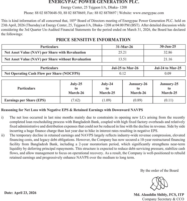 এনার্জিপ্যাকের তৃতীয় প্রান্তিক প্রকাশ