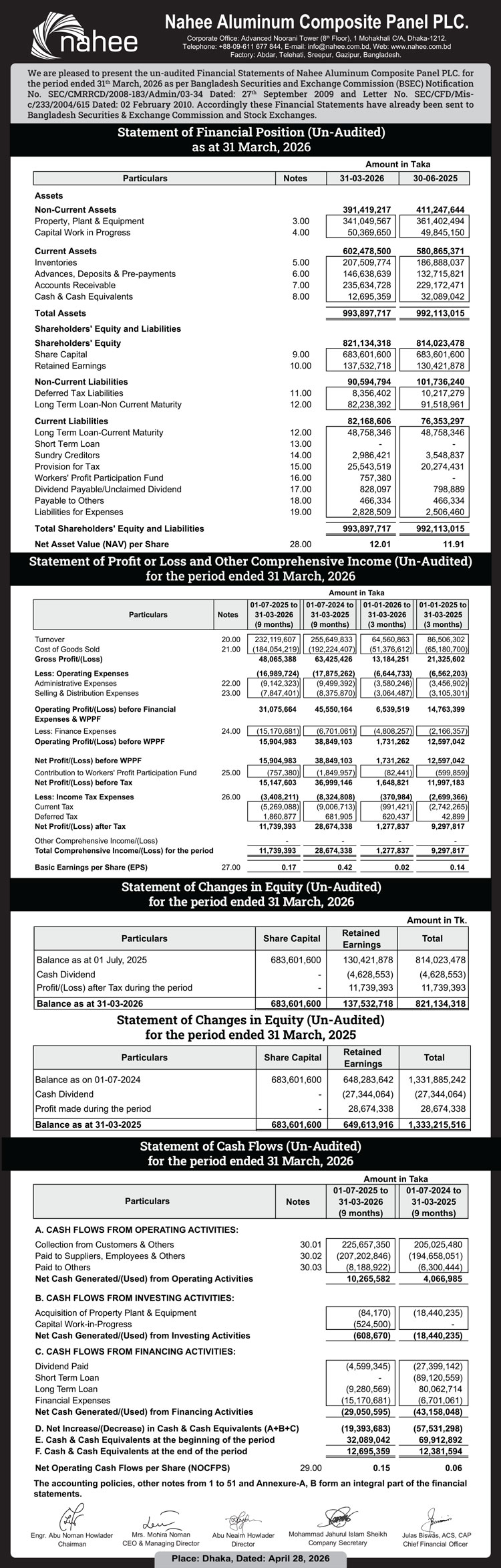 Statement of Financial Position (An-audited) of Nahee Aluminum Composite Panel PLC.