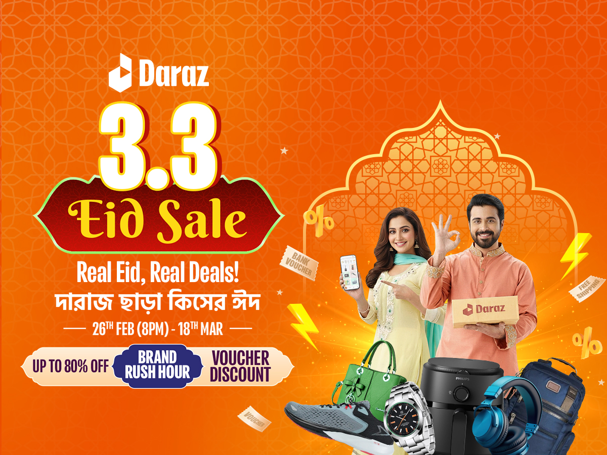 দারাজ ৩.৩ ঈদ সেল – উৎসবের সেরা সব অফার নিয়ে শুরু হলো ‘রিয়েল ঈদ, রিয়েল ডিলস’ মেগা ডিলে সর্বোচ্চ ৮০% পর্যন্ত ছাড়, সিলন ওয়ার্ল্ড কাপ ম্যানিয়ায় অংশ নিয়ে জিতুন ম্যাচ টিকিট, সঙ্গে সাইটজুড়ে ফ্রি ডেলিভারি সুবিধা