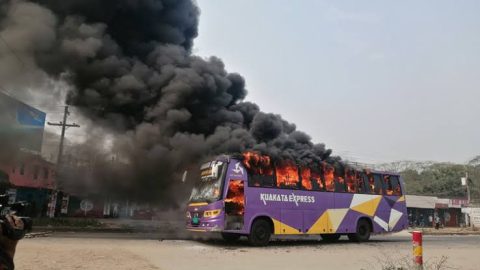 মহাসড়ক অবরোধ করে বাসে আগুন ববি শিক্ষার্থীদের
