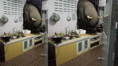গভীর রাতে দেয়াল ভেঙে রান্নাঘরে হাতি!