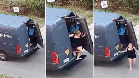 অ্যামাজনের ডেলিভারি গাড়ি থেকে বের হলেন নারী